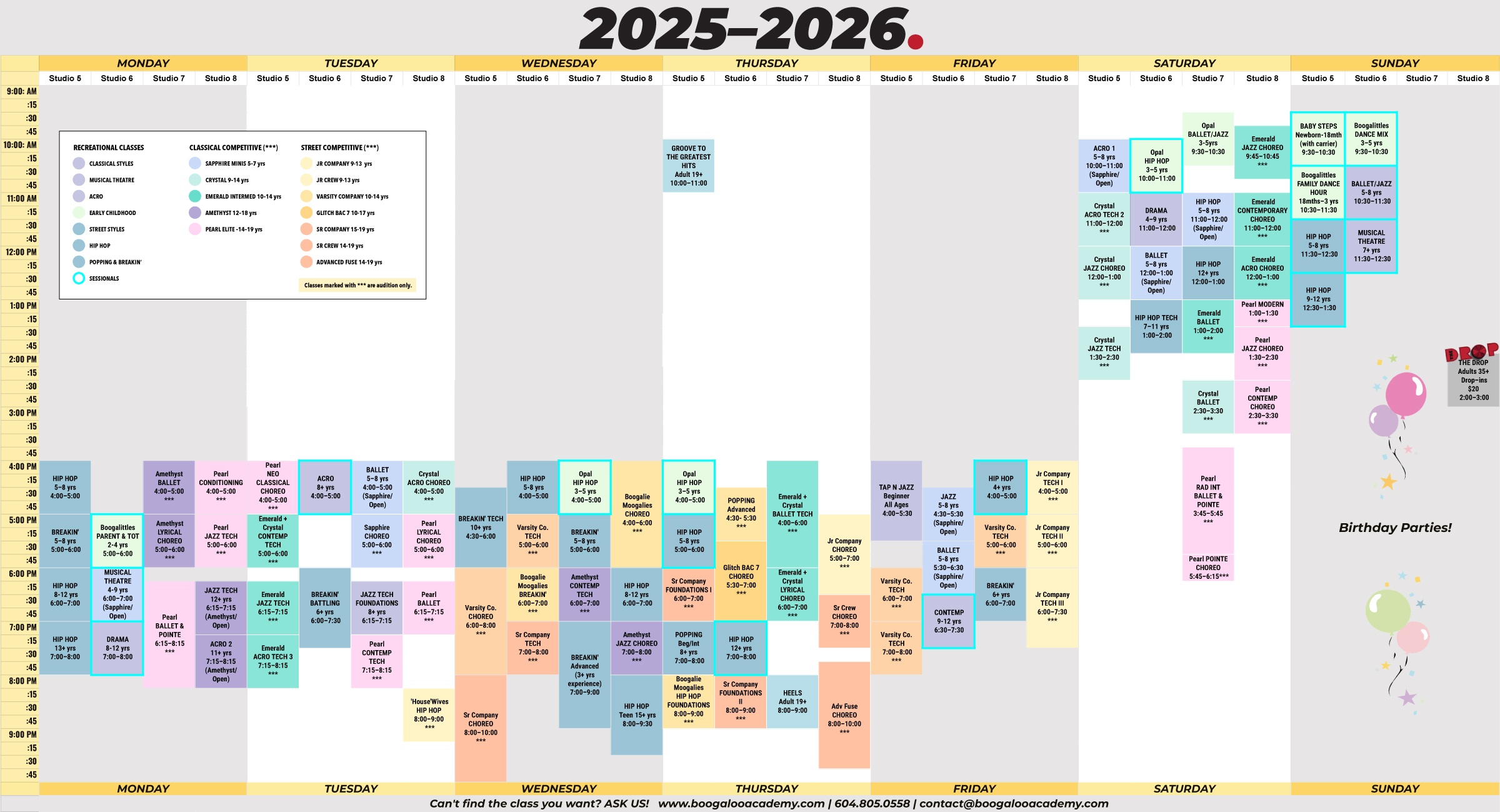 Check out our 2025–2026 class timetable below to see all of our full-season recreational, full-season competitive, and sessional offerings at a glance. Ask us about our new student offer to save $100!